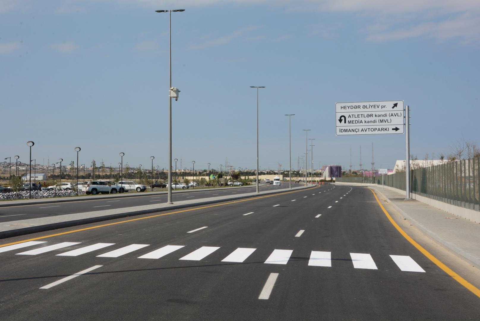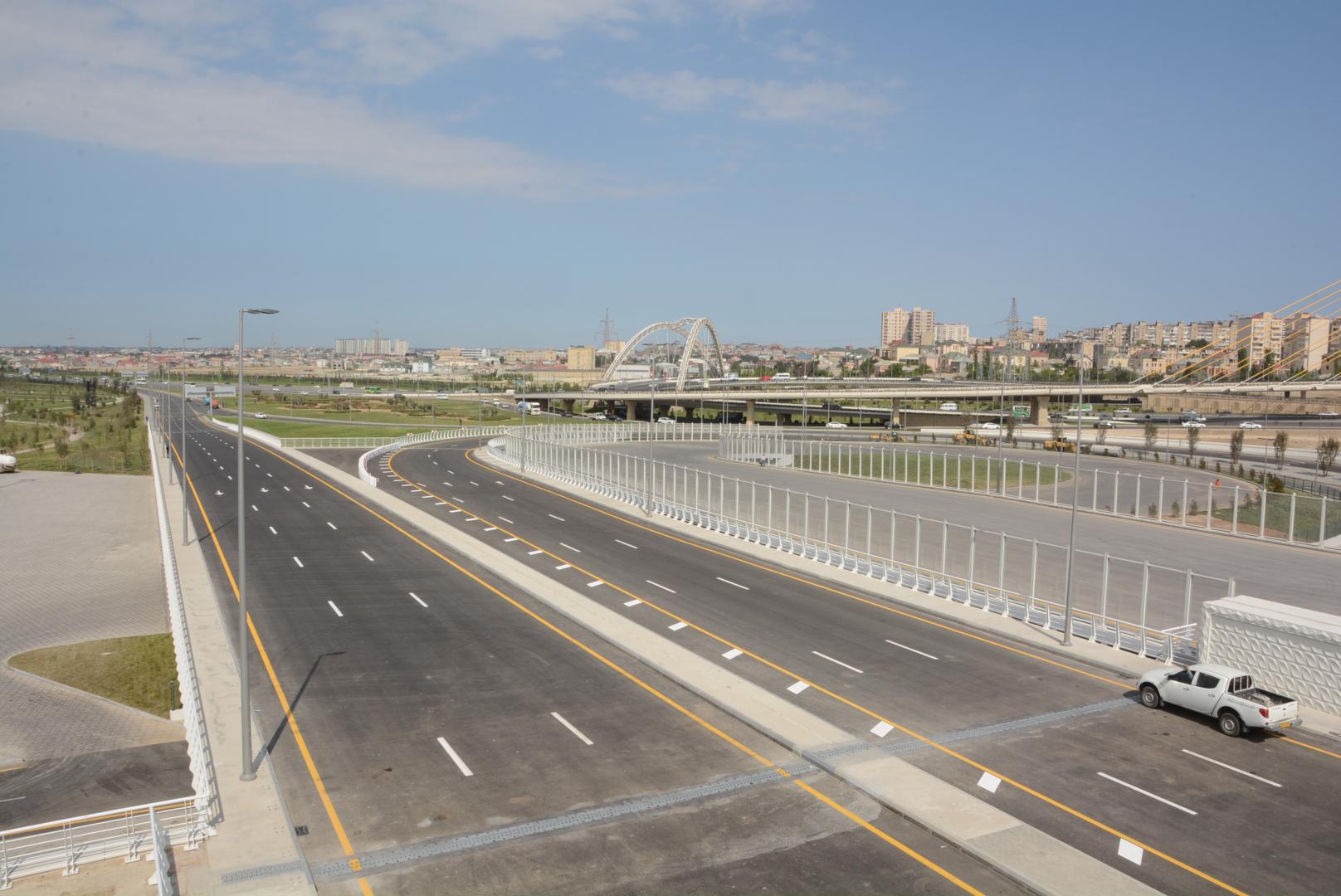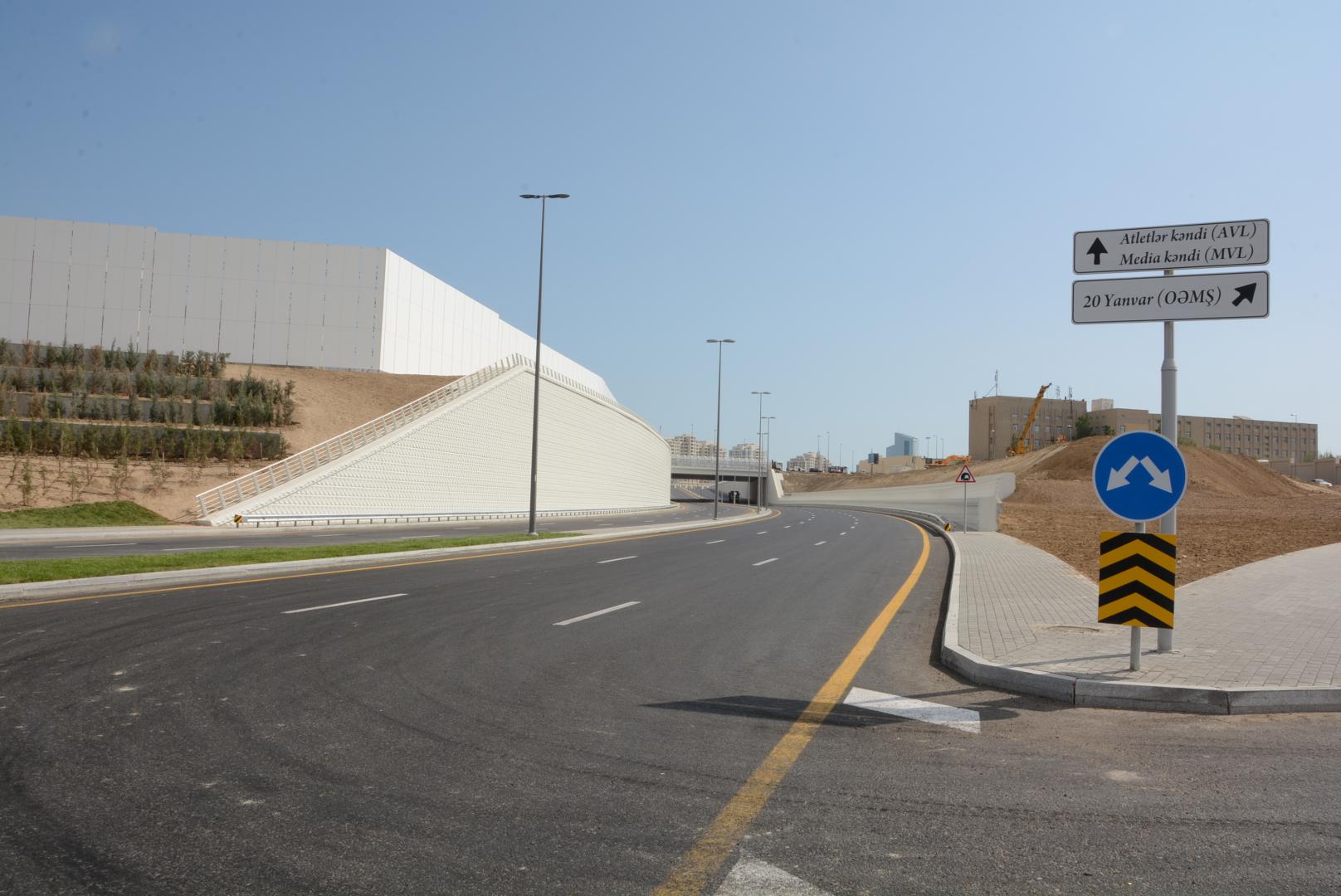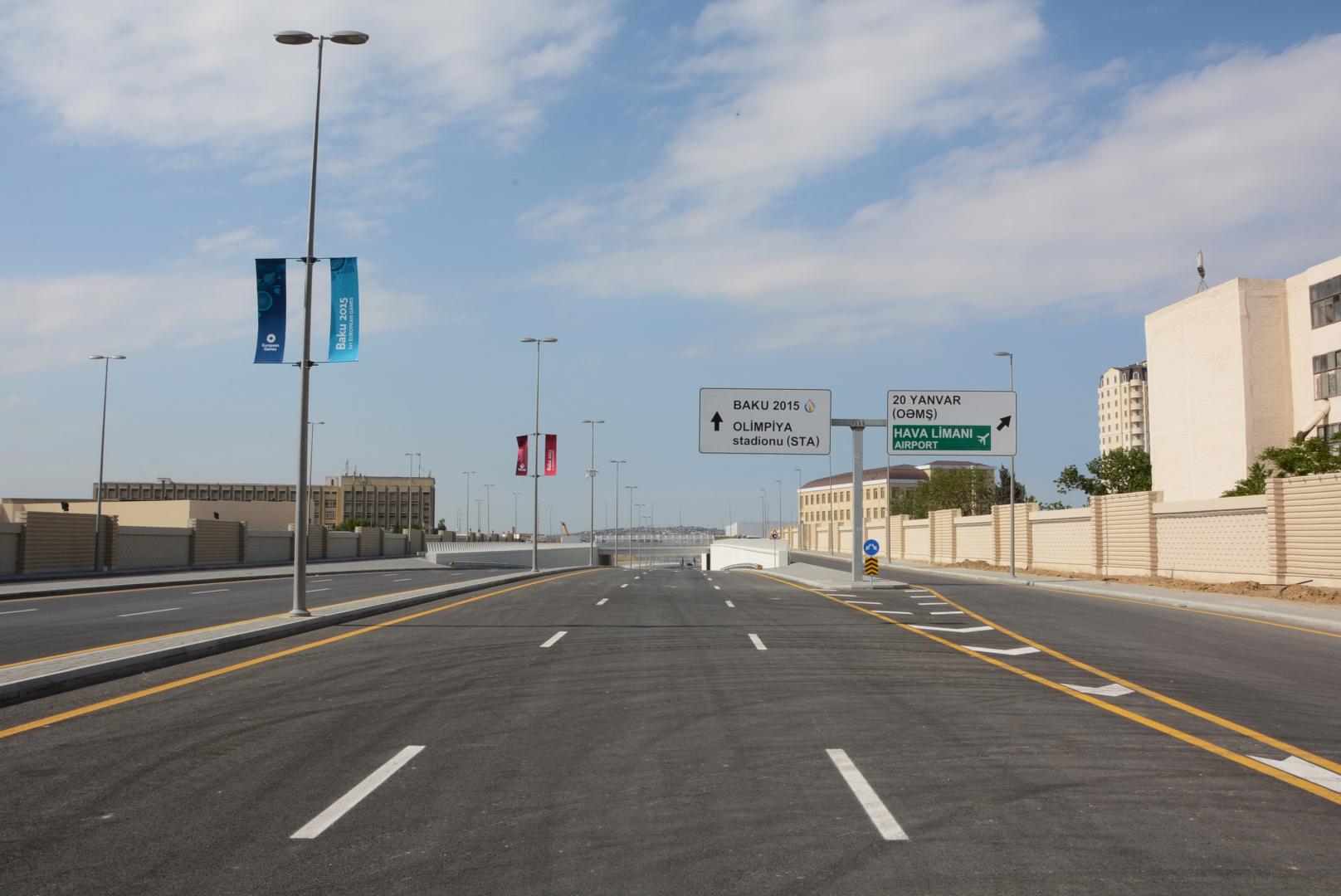 Həsən Əliyev küçəsindən Ziya Bünyadov prospektinə paralel olaraq metronun “Koroğlu” stansiyasına qədər yeni avtomobil yolunun inşasının birinci hissəsi əsasən Bakı Olimpiya Stadionu ətrafındakı əraziyə düşür. Burada işlər yüksək səviyyədə həyata keçirilib. Yol boyunca 2 körpü inşa olunub. Birinci körpünün uzunlüğü 205, ikinci körpünün uzunluğu isə 162 metrdir. Ərazidə uzunluğu 900 metrə, eni isə 30 metrə yaxın olan piyada yolu inşa edilib, yol üzərində iki tunel tikilib. Yolun qapalı hissəsinin uzunluğu 92, açıq hissəsinin uzunluğu 691 metrdir. Piyadalar üçün nəzərdə tutulan yolda 115 metr uzunluğunda kompleksə daxil olan üçüncü körpü də inşa olunub. Tuneldən keçən yollar Bakı Olimpiya Stadionu ilə Olimpiya şəhərciyini birləşdirir. Yarışları izləmək üçün avtobuslarla əraziyə gələn tamaşaçılar bu piyada yolu ilə Bakı Olimpiya Stadionuna rahat hərəkət edəcəklər. Bu layihənin reallaşdırılması dəgər tərəfdən metronun “Koroğlu” stansiyasına gələn bütün istiqamətlərdən həm şəhərin mərkəzinə, həm də Həsən Əliyev küçəsindən keçərək “Gənclik” stansiyası istiqamətinə qədər nəqliyyat əlaqəsini təmin edəcəkdir. Yeni avtomobil yolu, həmçinin Bakı qəsəbələrinin ölkənin beynəlxalq əhəmiyyətli magistralları ilə nəqliyyat əlaqəsinin asanlaşmasına kömək etməklə yanaşı, paytaxtın mərkəzi hissəsinin nəqliyyat yükünün azalmasına da öz təsirini göstərəcəkdir.